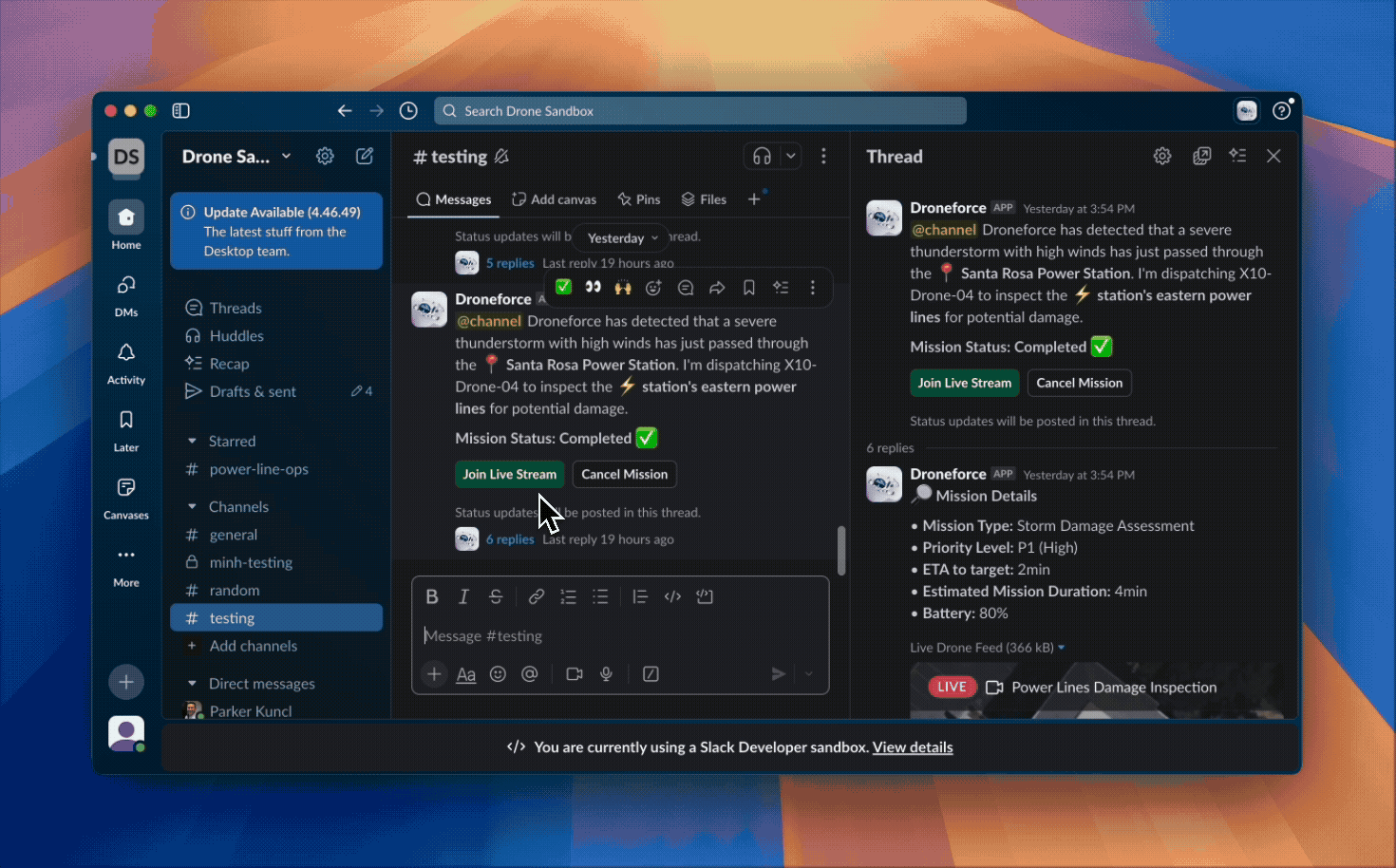 When a technician reports an issue in Slack, an AI agent automatically determines whether a drone should be deployed, launches it autonomously, and manages the entire first-response inspection. Live video, thermal scans, and environmental insights stream directly back into the thread. No forms, no clicks—just intelligent action.